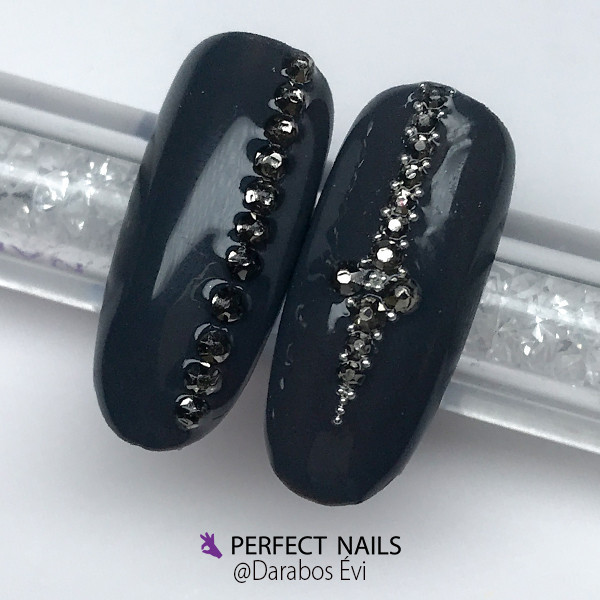 Az elkészült köröm felületét mattítsuk be, majd Glue Gel segítségével helyezzük fel a köveket a köröm felületére. 5-10 másodperc köttetés után fedő fénnyel zárjuk a körmöket a kövek körül is. A szebb hatás érdekében a kövekre ne tegyünk fedőfényt.