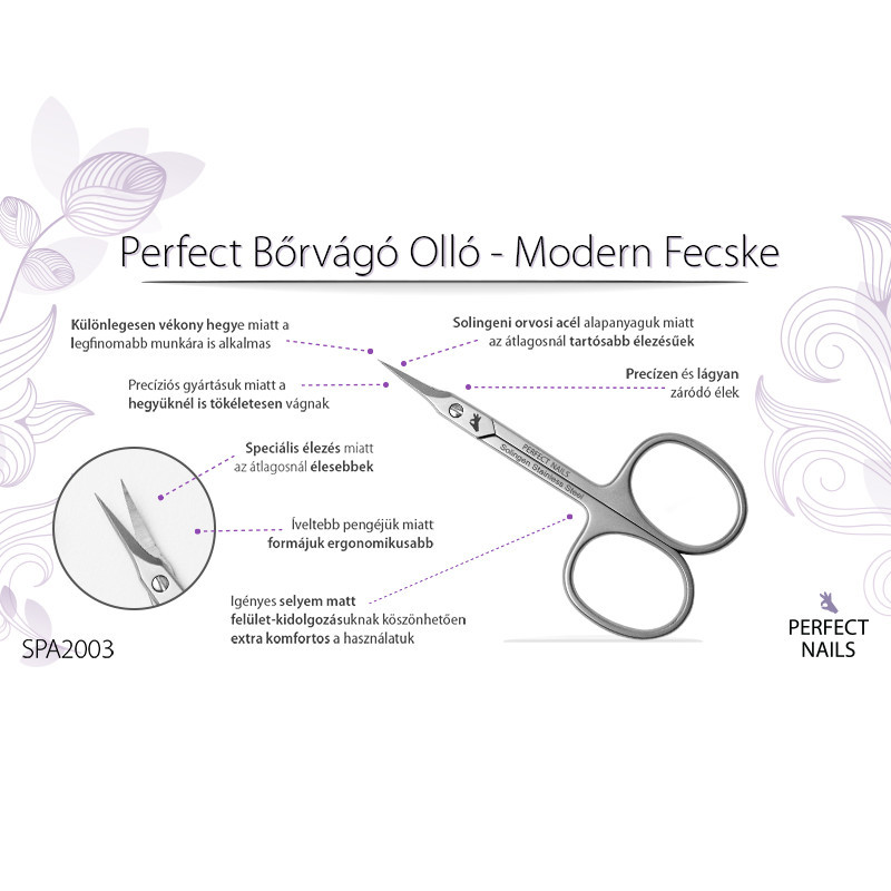 Precíz, extra vékony élekkel. Tűhegyes kivitel, elvékonyított fejjel. A kézápoló szakemberek ajánlják a bőrvágáshoz kiválóan alkalmas szuperéles, keskeny élű fecskefarkú bőrvágó ollót.Precíz kidolgozás, könnyű használata. Éle hosszantartó mind otthoni, mind professzionális használatra alkalmas.